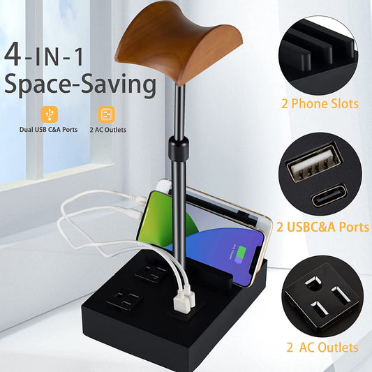 Headphone Stand Desktop Gaming Headset Holder with 2 AC Outlets and USB C&A Ports, Charging Station&Phone Stands, Height Adjustable Wood Earphone Table Game Accessories for Desktop Gamer