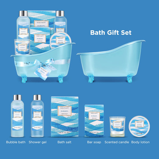 Spa Gift Baskets for Women, 7 Pcs Ocean Bath Set with Bubble Bath, Bath Salt, Body Lotion, Scented Candle, Spa Gifts